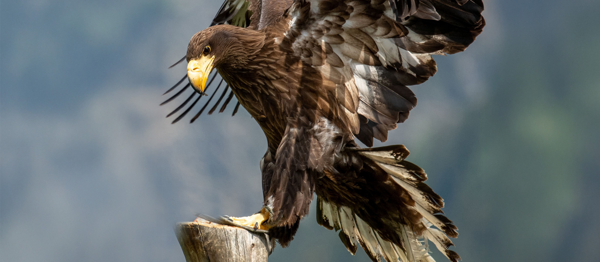 European white-tailed eagle are extremely faithful birds. Once two birds have found each other, they remain together for the rest of their lives. The European white-tailed eagle primarily feeds on fish that it skilfully plucks out of the water as it flies. It is, however, also able to catch small mammals on the ground or even waterfowl in mid-air. But it also certainly does not spurn carrion. When it is young, the European white-tailed eagle is a spotted, grey-brown colour. Only when it reaches sexual maturity at the age of approximately eight it does grow its adult plumage with grey head, dark overall plumage and white tail feathers.
